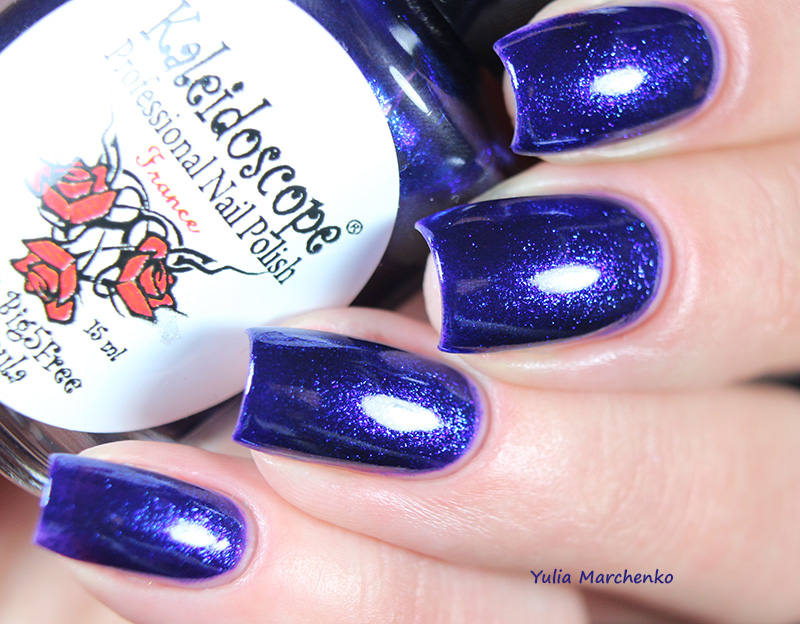 Kaleidoscope # Nd-04 Рак - имеет темно-синюю базу и яркий синий шиммер. Так же у лака есть небольшие вкрапления яркого малинового шиммера, что хорошо видно на макро.