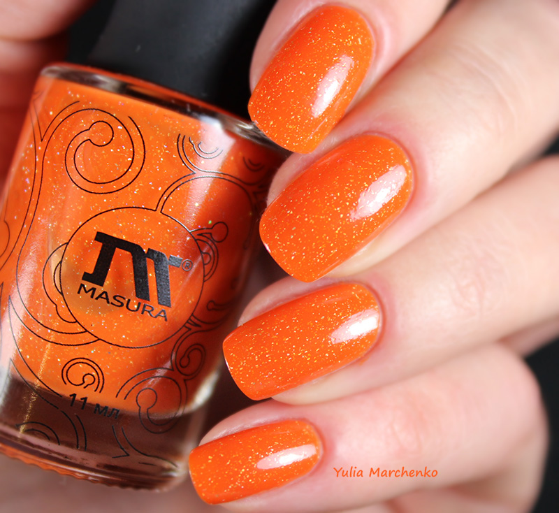 Лак Masura #1039 Апельсиновый Фреш вышел в продолжении Золотой Коллекции весна-лето 2016 и для меня он однозначный фаворит! В данном случае я не могу объективно судить этот лак, все оранжевые стают моими любимчиками, но этот оранжевый явно заслуживает особенного внимания - он яркий, сочный да еще и голографик, а особо приятным бонусом стала его покладистость. Этим лаком красить одно удовольствие - он прекрасно самовыравнивается и легко укладывается в два тонких слоя. Сохнет быстро - минут 15 и можно заниматься своими делами. Родной глянец просто потрясающий!