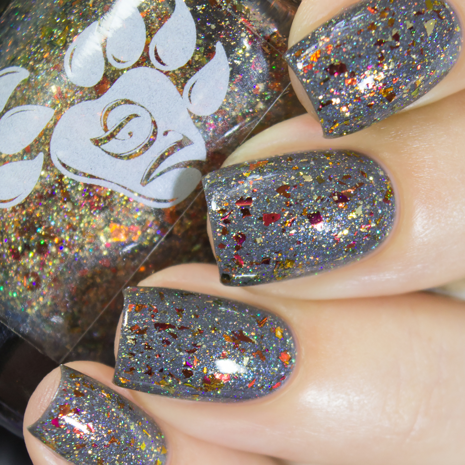 ELEPHANT'S GRAVEYARD - dark grey base with duo chrome shimmer and holographic flakies. Applied in two coats plus one coat of clear top.