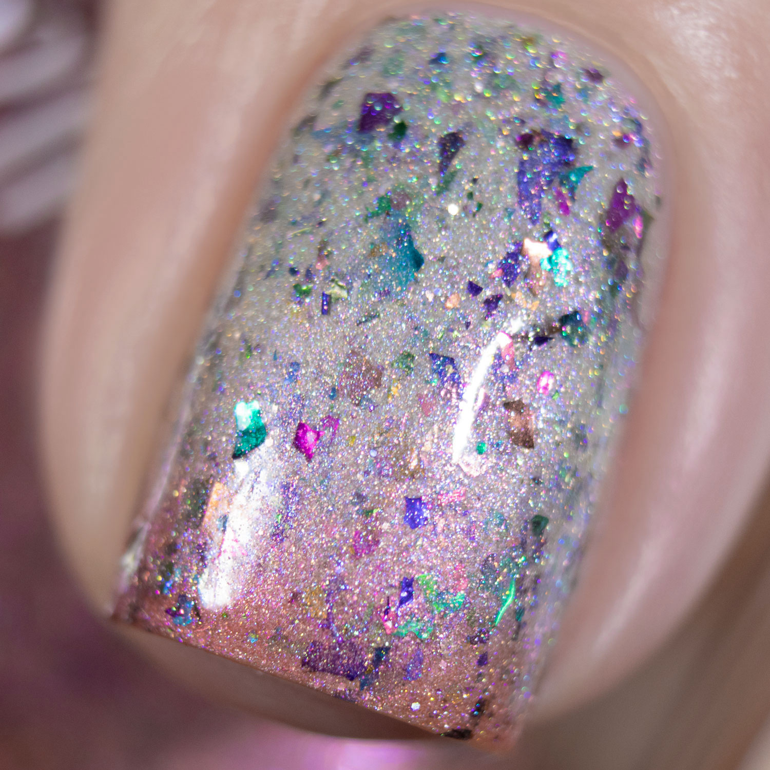 WINTER SKY: Light grey crelly with red shimmer, iridescent chameleon flakies in various colors and a subtle holo effect.